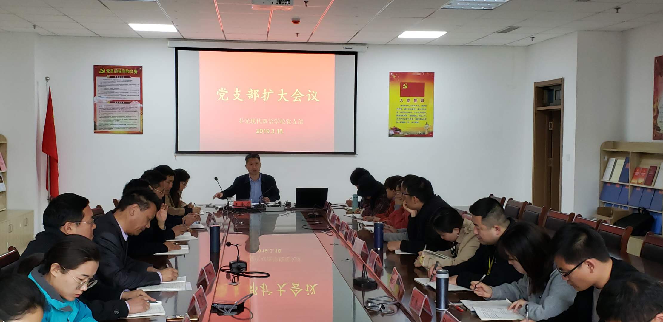 3月18号,现代双语学校党支部召开党支部扩大会议,检查总结上一阶段各项工作的落实、完成的情况,落实党员集中培训制度,安排部署下一阶段学校党建工作、教学常规、教学改良的各项措施的工作。
