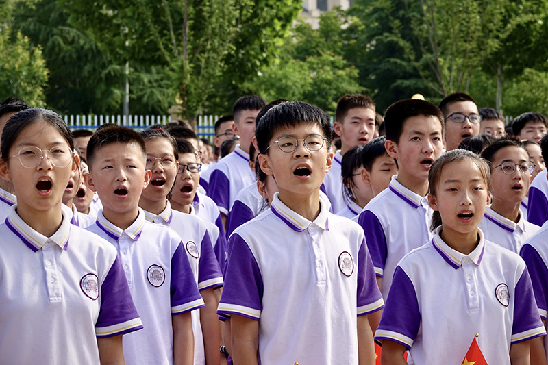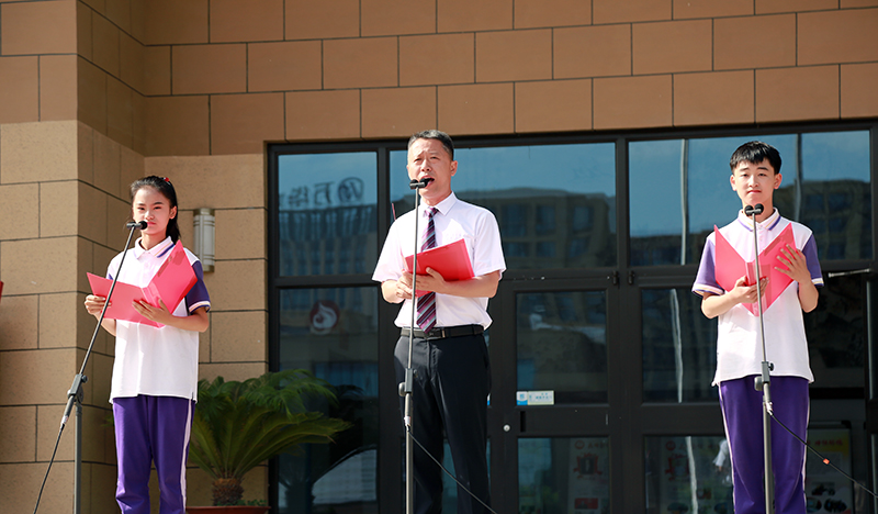 学校党支部书记、校长王永亮和学生代表贾丰歌、孙希茂在国旗下,饱含真情朗诵《红船,从南湖起航》。“一条游船,劈开了南湖的波浪,十几个热血青年,在运筹一个红色的理想.....”在热血澎湃的朗诵中,一幅书写着百年大党奋斗历史的长卷徐徐展开。历经百年艰辛,中华巨龙已然腾飞,中华梦接连实现,一代代中国少年的努力,迎来了少年中国的春天。三千多名现代明德少年以澎湃的气势齐诵《少年中国说》,展示了中国少年的豪迈。