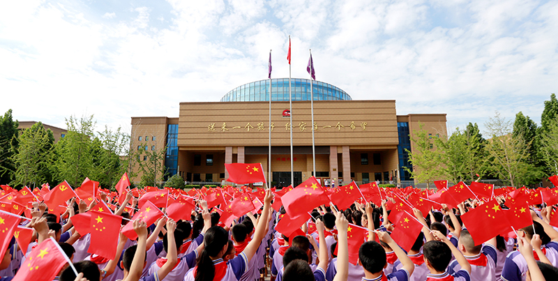 《闪闪的红星》《共产儿童团歌》《没有共产党就没有新中国》全校近四千名师生满怀着对党、对祖国的深情,跟随着歌曲的旋律,挥舞手中的国旗、党旗纵情高歌。