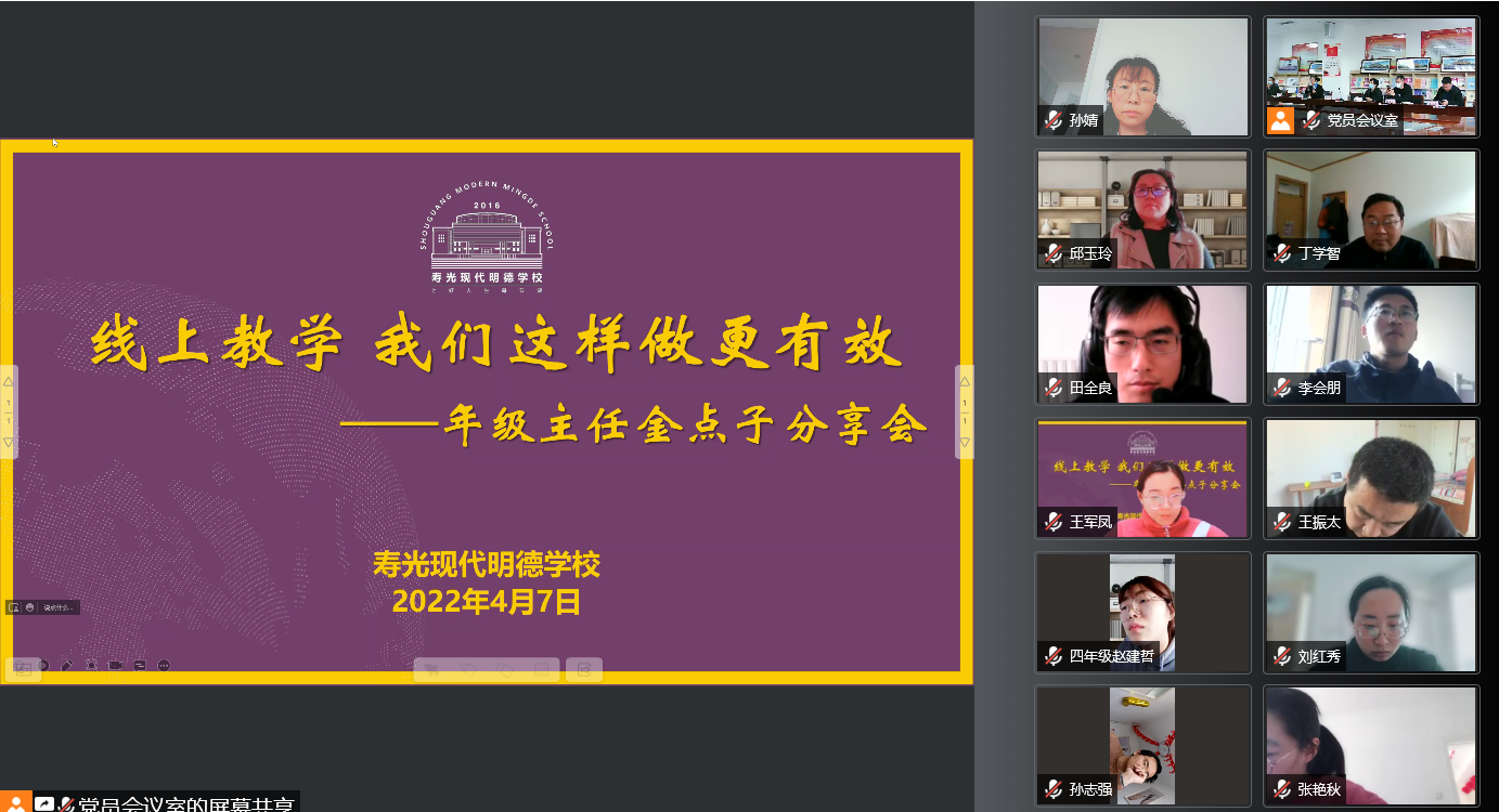 为帮助老师更好的提升网上教学的质量,打造明德网课品质,4月7日和10日,学校分别举行线上教学金点子分享活动。14位干部立足教学实际,围绕创新共赢的主旨,有针对性地分享了自己的线上教学管理经验,以及教学路径上的突破和创新;小学部和初中部的级部主任代表、备课组长代表聚焦线上课堂,与全体老师毫无保留地分享了自己的独家妙招和闪光智慧。
