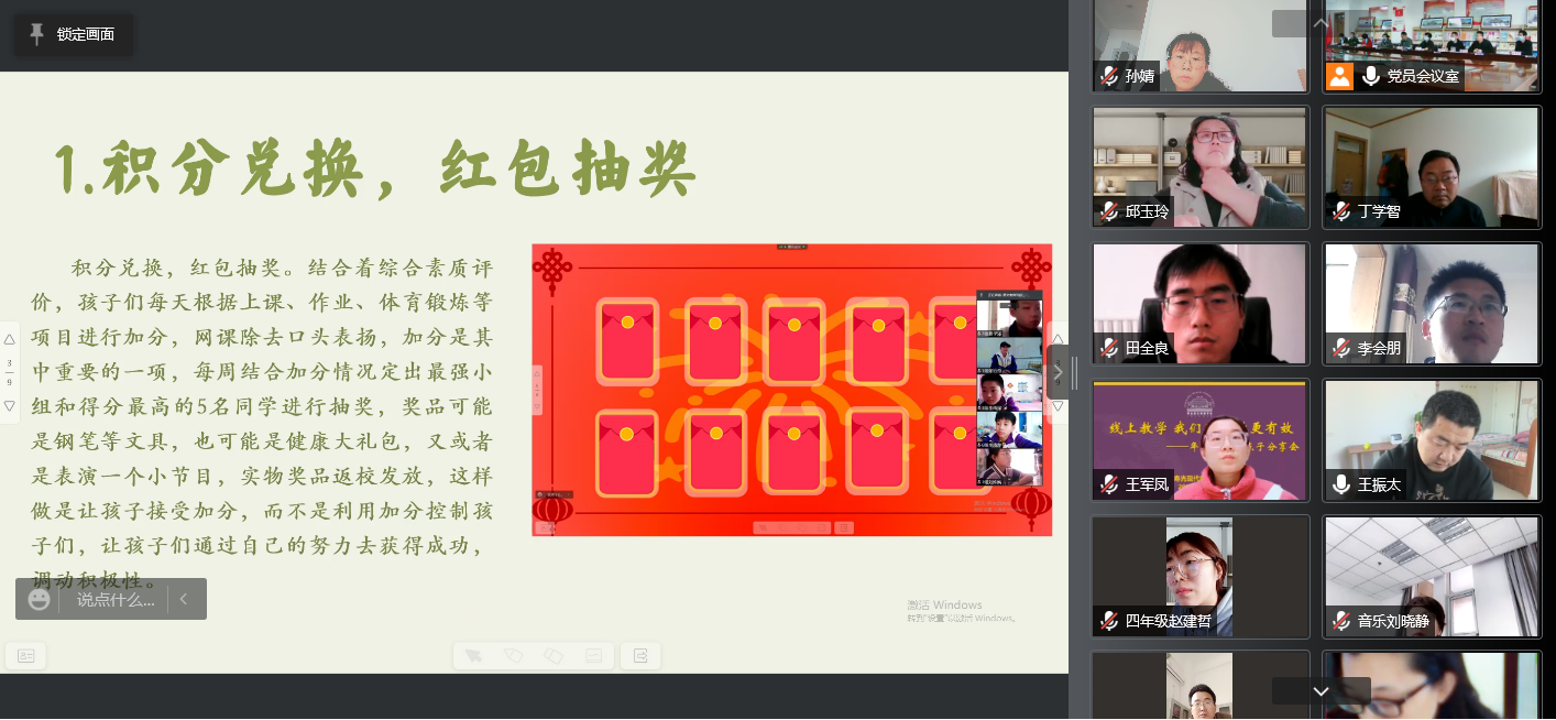 从双班主任驻班、双设备授课,到分层评价、积分兑换奖励;从检测学生早读声音的软件,到花式“晾晒”学习成果......干部们的发言,句句来源于教学实际,可操作性强,借鉴意义大,从课堂管理、学生关爱、学习效果的再提升、学习积极性的再强化等方面,不断探索教学新路径,挖掘软件功能,补齐线上教学短板,打破一个个线上教学的瓶颈,为线上教学的可持续优质发展提供了强大助力。