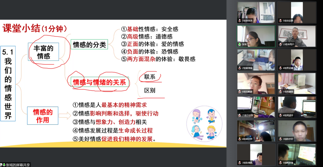 育人教研聚焦学生的课堂管理,同学部、班级育人共同体的老师们通过日教研,不断调整、创新线上指导、评价模式,破解视屏时间长的疲劳、无人监管的懈怠、电子产品的诱惑等问题,在学生的注意力上持续做文章,调动学生的学习积极性,激发学生兴趣。