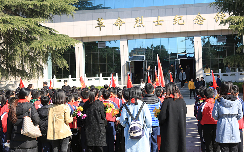 参加祭扫活动的学生佩戴红领巾,手握自制小白花,排着整齐的队伍,怀着对烈士无限崇敬的心情在徐翔副校长的带领下来到寿光烈士陵园。