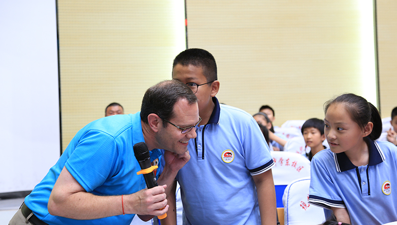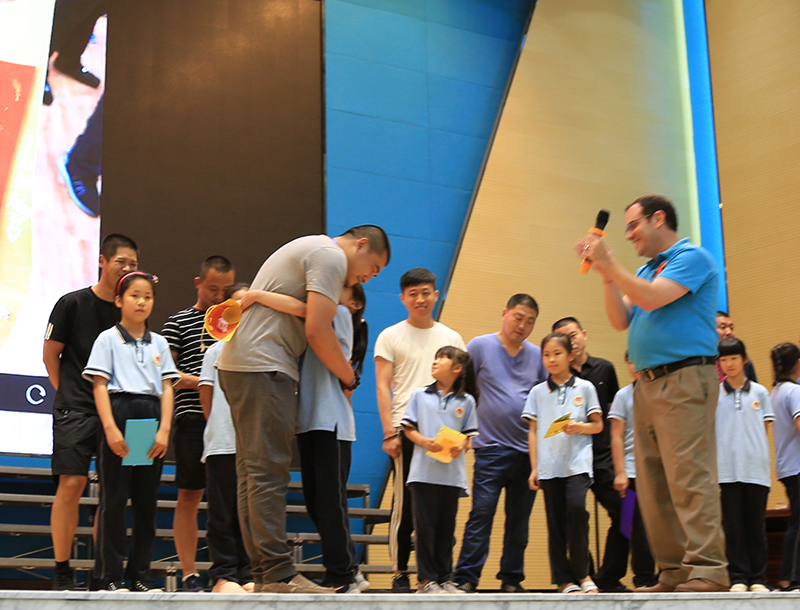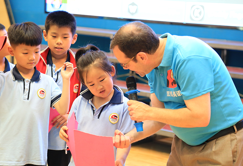 6月14日上午,现代双语学校开展双线英语嘉年华活动,活动中,为了鼓励孩子们勇敢开口说英语,来自美国德克萨斯的外教老师Joseph老师带领全场,边唱边跳,活跃现场气氛的同时,鼓励孩子们放下紧张与害羞,大胆开口。游戏环节里,Joseph老师用丰富的肢体语言和纯正的英语发音给孩子们示范游戏规则,孩子们在玩中学,在学中玩,现场的欢笑声此起彼伏。