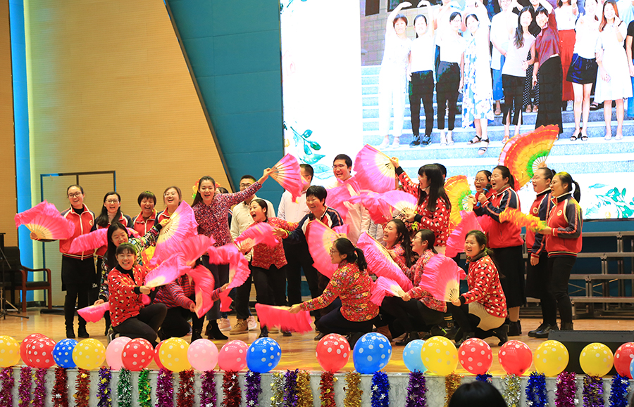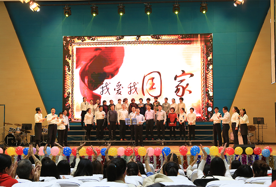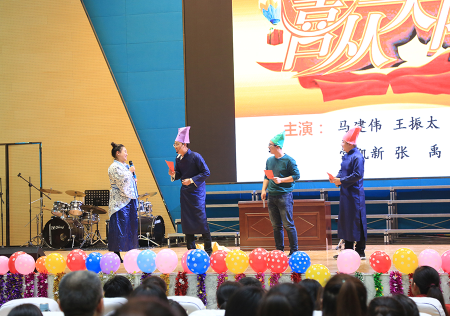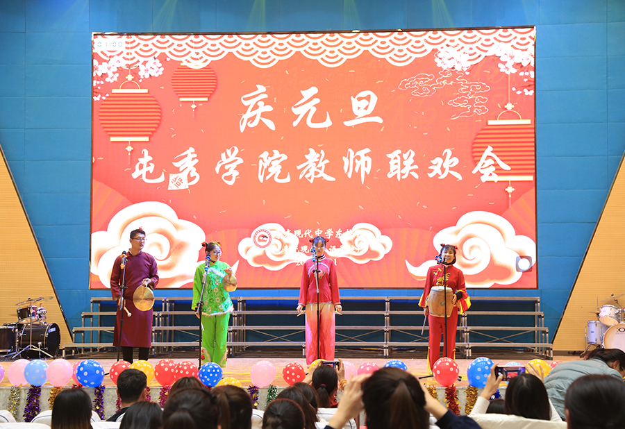 又到辞旧迎新时,12月21日下午,现代中学东校区全体老师齐聚一堂,喜迎新年。联欢会上歌声悠扬,舞姿蹁跹,学校各学部及行政组“各显神通”,自编、自演、自排的近30个节目有歌舞、小短剧、戏曲、朗诵、合唱、独唱等轮番上阵,充分展现了东校老师们的创意和活力。在《生日帽蒙眼踢毽子》、《你比我来猜》、《疯狂猜歌名》等游戏环节,老师们有趣搞笑的表现让全场笑声掌声不断。整场晚会,歌声、笑声、掌声、欢呼声交融在一起,全体教职工的希望与热情都在此刻被点燃,欢乐气氛洋溢在礼堂每一个角落,笼罩着每一位教师,2个多小时的欢声笑语给全体教师留下了美好的记忆。