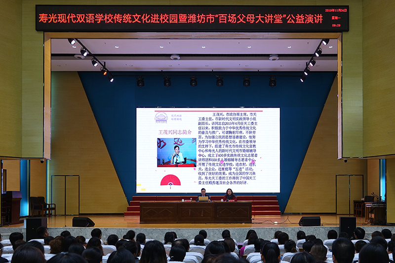2019年11月4日上午,寿光现代双语学校邀请寿光市政协原主席、市关工委主任、市新时代文明实践领导小组副组长王茂兴同志在润德礼堂内,为双语家长们带来了一场以《学习优秀传统文化,教育子女立德树人》为题的精彩传统文化讲座。