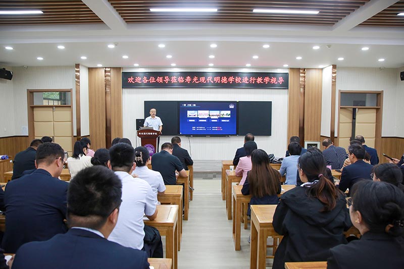 张友全校长以《让每个奋斗的明德人都被看见》为题,从立足五大行动,创新再提“速”;教学成果凸显,发展再提“质”;回应时代要求,育人再提“标”三个方面,向教研员汇报了学校一年来在学校建设方面的新举措和新成绩。张校长还重点介绍学校聚焦教学教研,围绕潍坊市教学改进行动,所采取的坚持育人为本的校长课程领导力提升行动、基于课程标准的教学评一致性课堂改进行动、促进素养提升的进阶式教师专业发展行动、指向减负提质的作业设计优化行动、聚焦核心素养的命题能力提升行动。