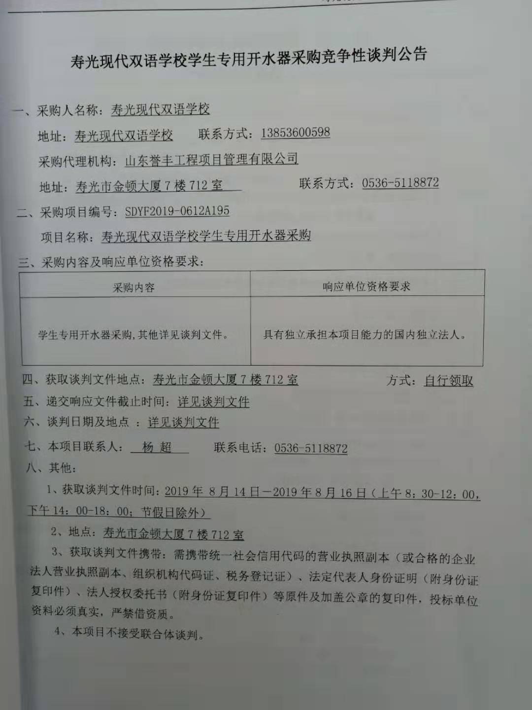 寿光现代明德学校学生专用开水器采购项目招标公告