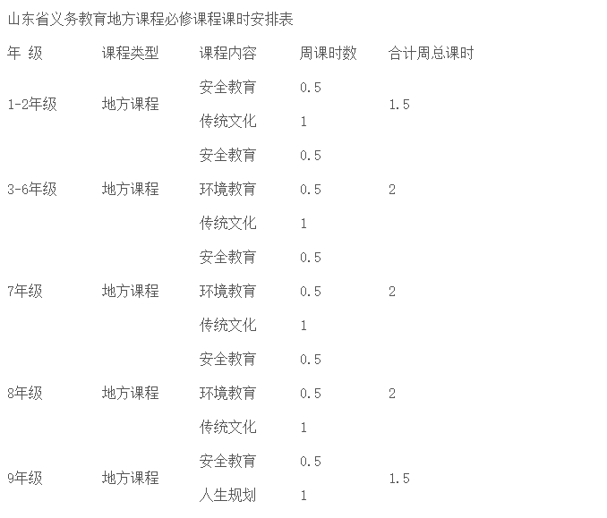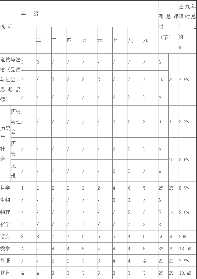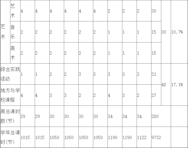 说明:根据《教育部关于印发中小学综合实践活动课程指导纲要的通知》(教材〔2017〕4号),要求:综合实践活动课程小学1—2年级,平均每周不少于1课时;小学3—6年级和初中,平均每周不少于2课时;高中执行课程方案相关要求,完成规定学分。综合实践活动课时含信息技术必修课程1节。