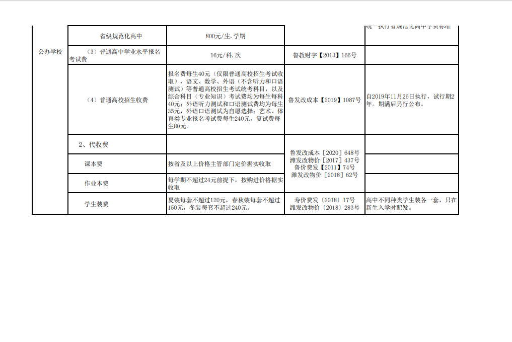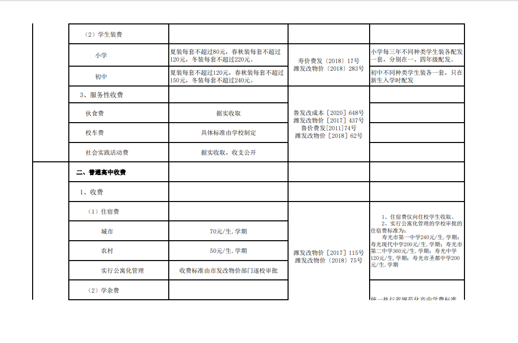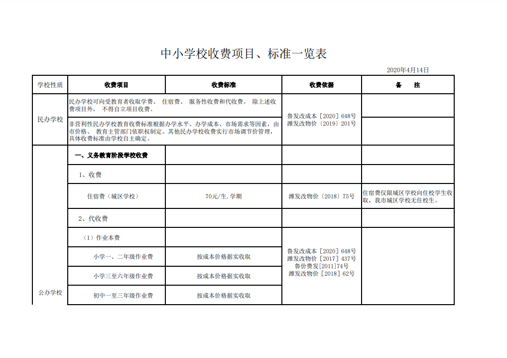 中小学校收费项目、标准一览表