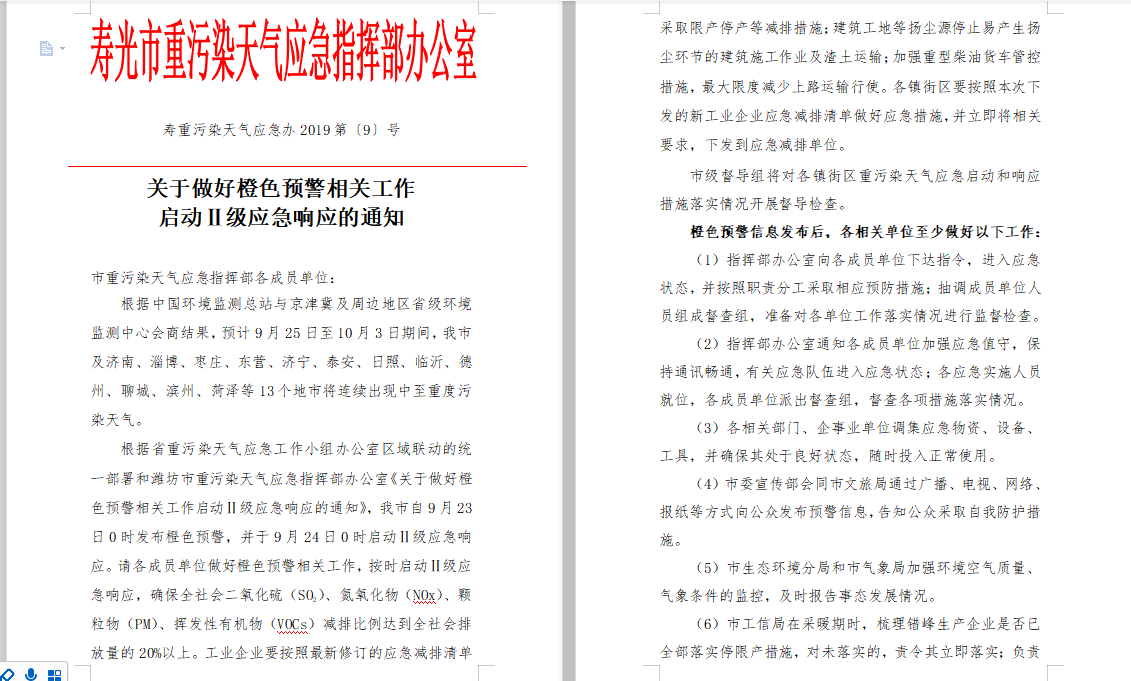 2019年9月25日寿光市重度污染天气应急指挥部办公室——天气污染橙色预警