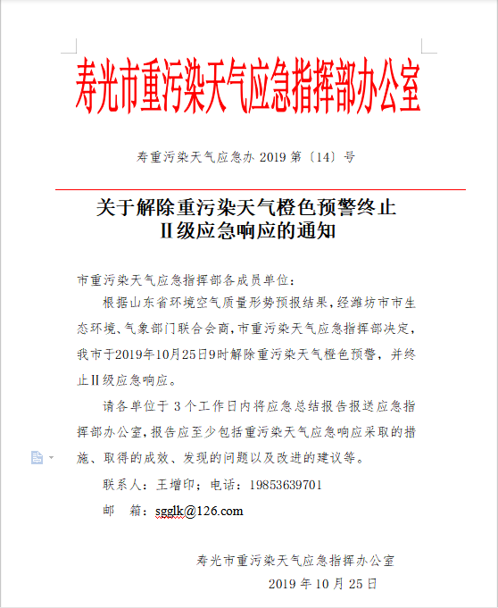 2019年10月25日寿光市重度污染天气应急指挥部办公室——解除天气污染橙色预警