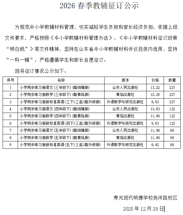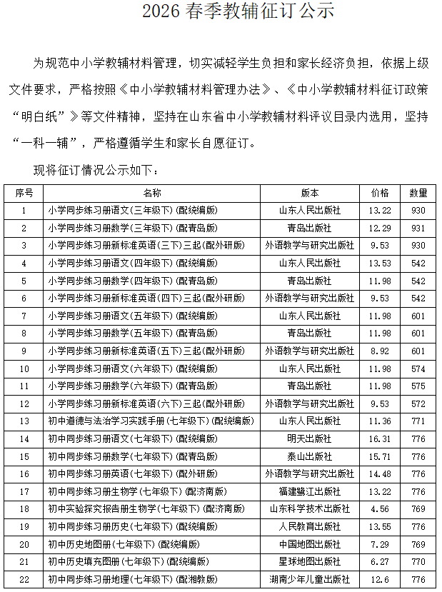 2026春季教辅征订公示