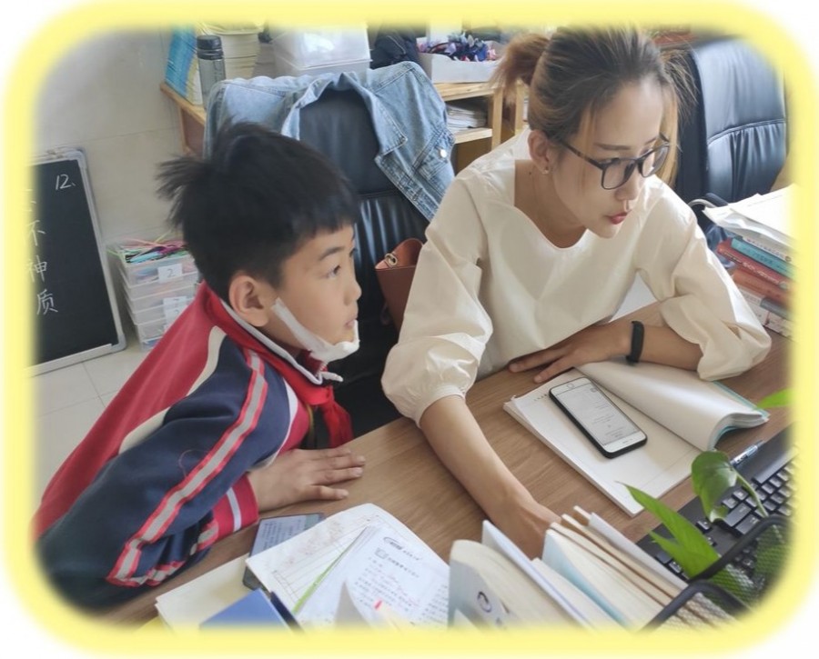 照片中是班里的孩子生病了,邱老师帮孩子补习,邱老师总是用耐心和执着呵护着每一个孩子,从不曾见过她对孩子们严肃的样子。她在五年级级部就像是一块“砖”,哪里需要哪里搬,哪个班有老师请假,她就会成为哪个班的班主任,没有任何的抱怨。