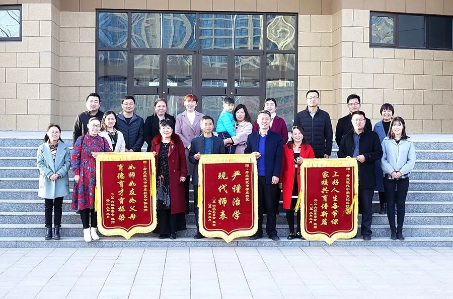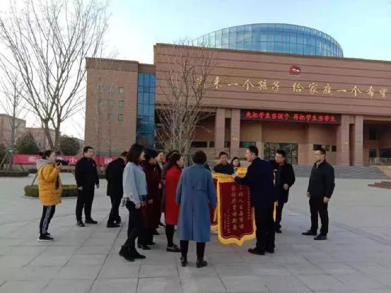他们说:“孩子在校三年,老师对孩子们无微不至的关怀、爱护和付出,我们看在眼里,记在心里,感恩的心无以报答,请学校和老师们接受我们最诚挚的敬意!用这锦旗一起表达我们对学校的感谢,对老师们的感恩!”