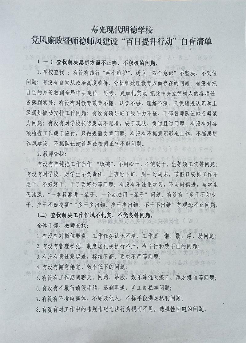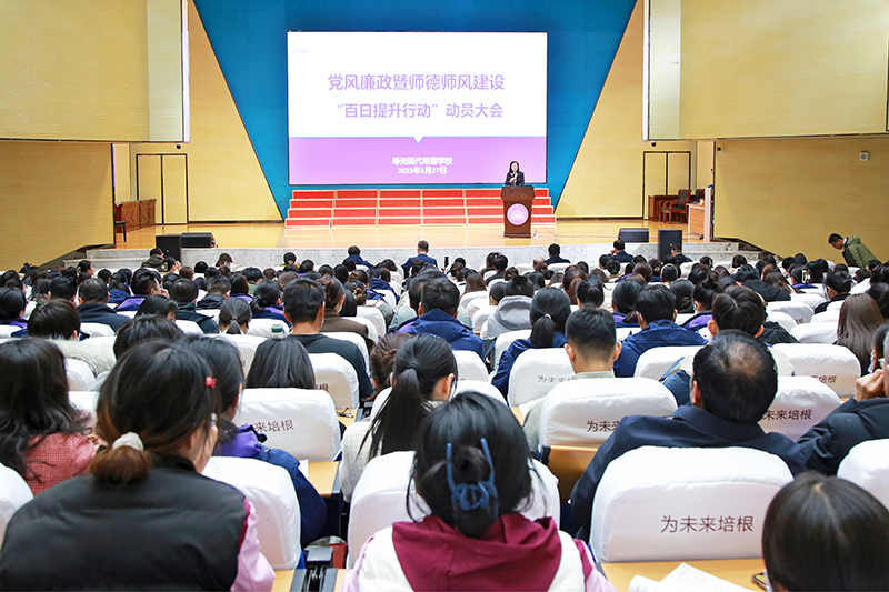 立足政治站位,上“高度”。为将“百日提升行动”的会议精神传达到位,落实到位,学校专门召开全体教师动员大会,解读会议内容,要求每位教师以会议的各项要求为标准,找问题、清风气、谋策略,实现教师素养的整体性提升。学校面向全体教师发放《寿光现代明德学校关于“加强师德师风建设”教师行为规范调查问卷》《寿光现代明德学校教师师德修养红线29条》,开展自我反思,通过查问题、明底线,压责任,扬清风正气,统一行动思路,明晰提升方向。