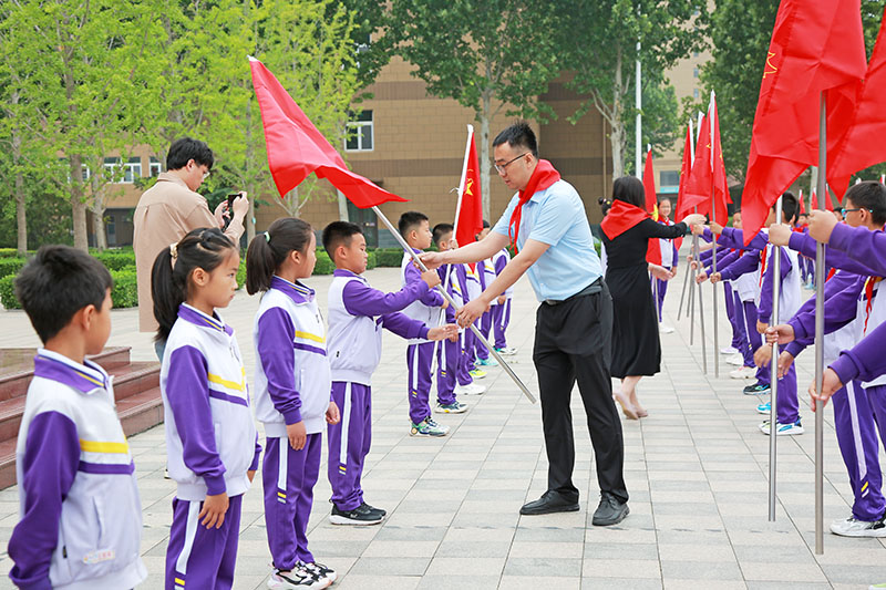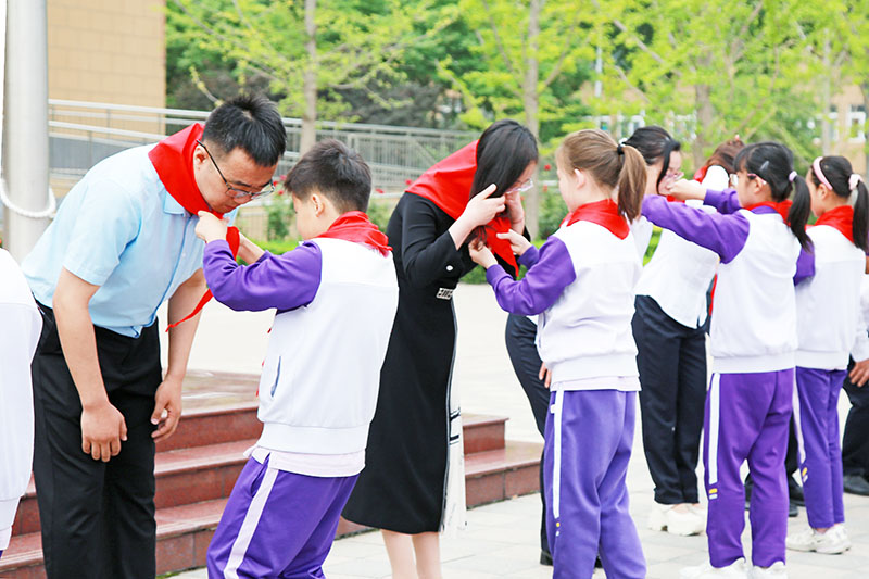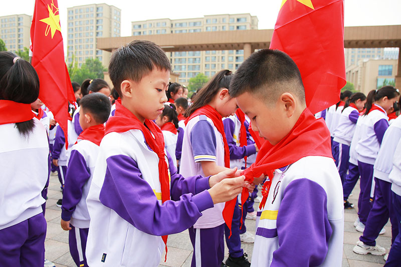 四年级的优秀少先队员们郑重地为每一位新队员佩戴红领巾,将红色的责任和使命传递了下去。