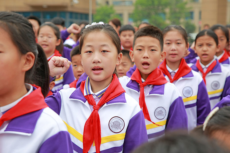 全体新入队少先队员在大队长的带领下,举起右拳,庄严宣誓:准备着,为共产主义事业,贡献力量!
