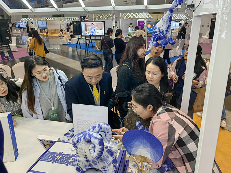 现代明德学校受邀展示扎染校本课程《非遗传承·布里生花》。该课程以传承非遗文化为研究导向,以提升学生艺术素养、坚定文化自信为研究出发点,依托项目化学习,以校级社团课程为实施载体,课程设计涵盖植物种植——染料提取——布料染色——作品设计——手工制作——产品展演的整个流程,通过艺术体验为核心的多样化实践,掌握扎染技艺,实现“扎染”的创造性传承和“五育融合”教育。
