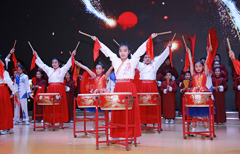 铿锵的鼓点,撞击每一个人的心扉,激昂的旋律,敲出了欢乐与幸福,他们大开大合的武术动作,灵动的健美操,孩子们火力全开燃爆全场!