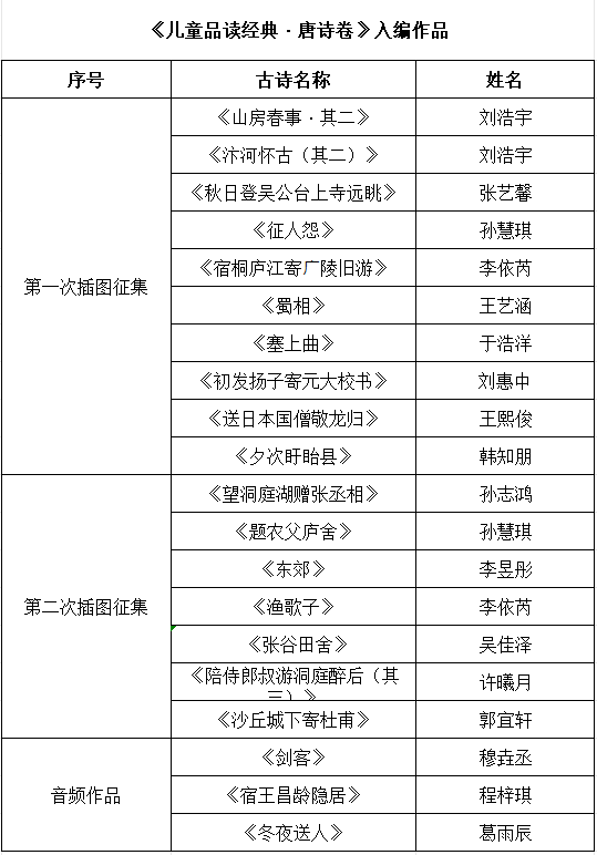 在江苏凤凰美术出版社出版的《儿童品读经典·唐诗卷》中,我校14名学生的诗配画、3 名学生的朗诵音频被选用刊登。