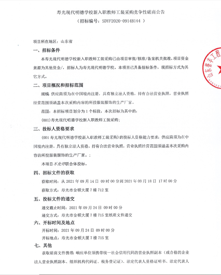 寿光现代明德学校新入职教师工装采购项目已通过中国招投标公共服务平台面向全国公开招标公示,并完成招投标工作。
