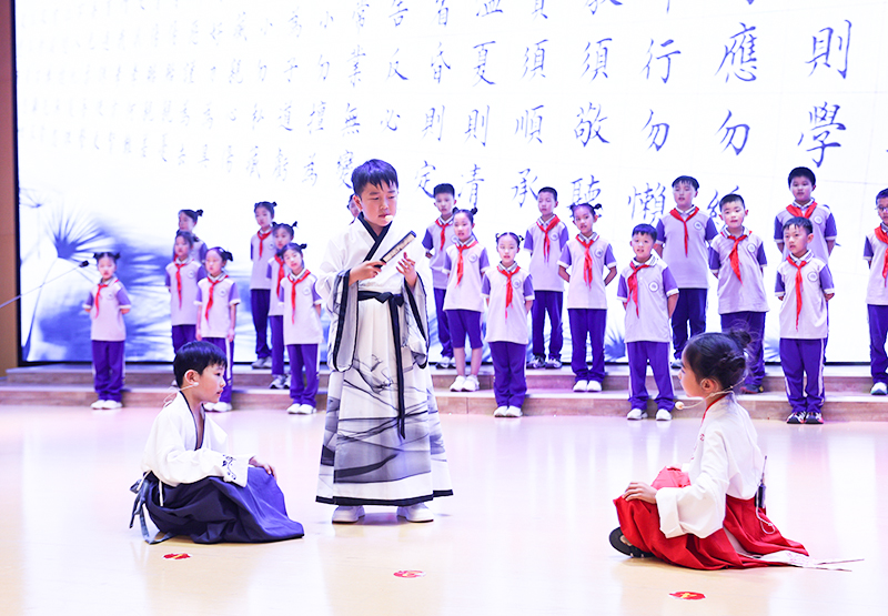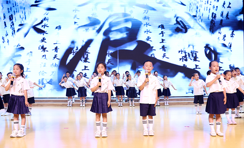 童声诵字,春雨润书。经过老师的精心布置和细心指点,孩子们或围成圆圈,依次轮读;或情景再现,小品对话;或齐声划一,语气铿锵……孩子们以崭新的舞台形象,将古词的新韵演绎出诗词内涵,赓续中华五千年的文化血脉。