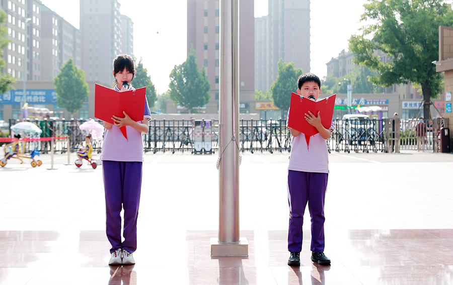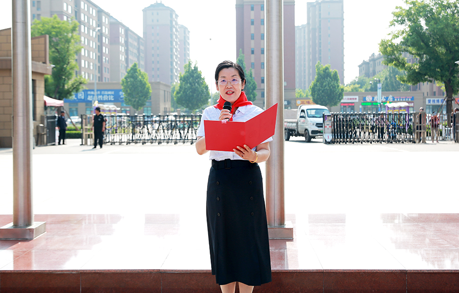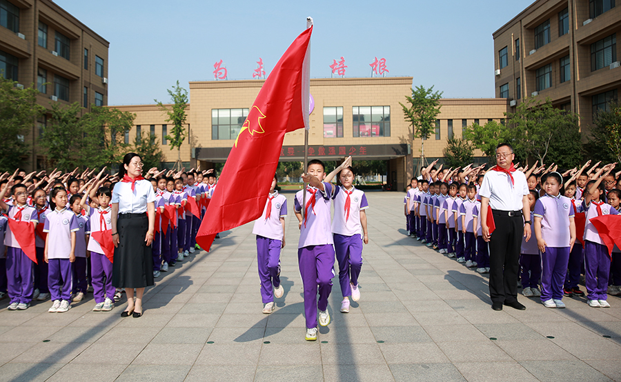 雄壮的国歌声,激昂的出旗曲,迎着招展的五星红旗,迈着铿锵有力的步伐,少先队大队旗手与护旗手们高擎中国少年先锋队队旗,昂首挺胸,斗志昂扬,为仪式拉开序幕。全体少先队员庄严肃立,向队旗敬礼,高唱《中国少年先锋队队歌》。
