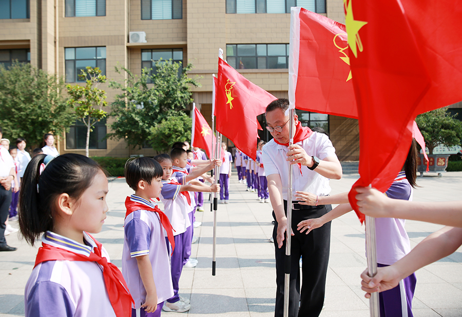少工委主任张友全同志为新中队授中队旗。少工委副主任徐翔同志宣读了聘任少先队辅导员的决定,并为新聘请中队辅导员颁发聘书。在热烈的掌声中,学校一年级中队正式成立。鲜红的旗帜下,张友全同志为新队员们提出希望:希望他们热爱祖国,勤奋学习,团结互助,树立榜样,在旗帜的引领下,志存高远,努力实践,做中队的阳光小使者,努力成长为有理想、有本领、有担当的新时代好少年!